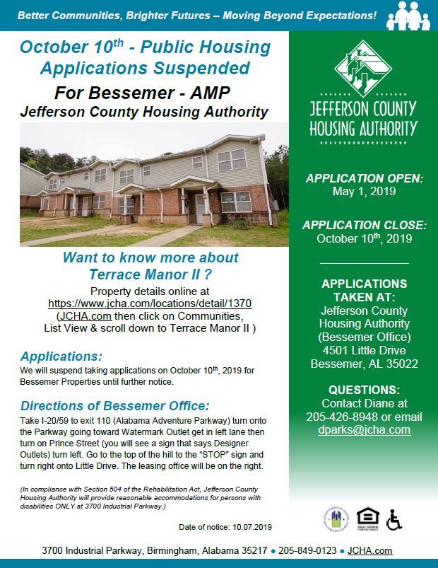 October 10th Public Housing Applications Suspended For Bessemer Properties 10 09 2019 News Jefferson County Housing Authority Jefferson County Al